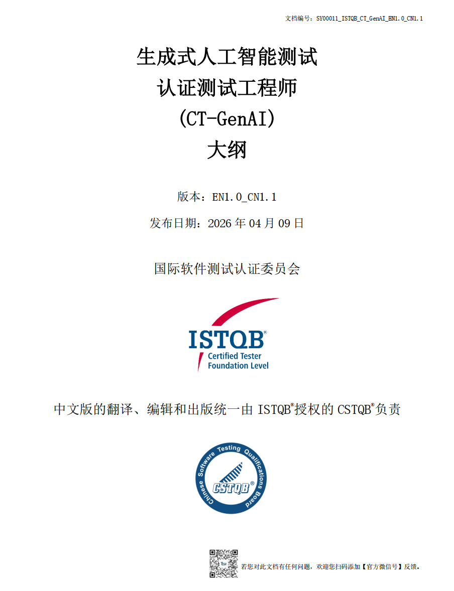 由领测国际贺老师作为本地化工作组组长的生成式人工智能测试认证(CT-GenAI)大纲正式发布了。